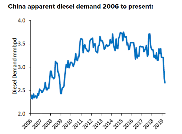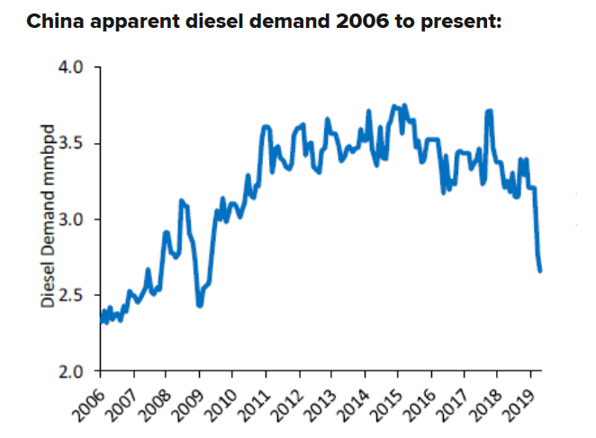 CNBC recently reported that China’s diesel demand is falling off a cliff: