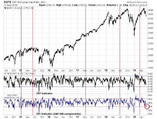 There are numerous signs that the market is oversold. I monitor the Zweig Breadth Thrust Indicator for signs that the market might undergo a bullish stampede. The setup for a ZBT is an oversold condition on the ZBT Indicator. While stockcharts reports the ZBT Indicator with a lag, I have developed my own estimate, based on both the NYSE breadth statistics originally used by Marty Zweig, and my own estimates based on solely S&P 500 components (bottom panel). The SPX ZBT Indicator flashed oversold signals last Wednesday and on Friday. While oversold conditions do not guarantee a ZBT buy signal, all of the past instances in the last five years when the SPX ZBT Indicator was oversold, but the official ZBT Indicator was no, have resolved themselves with short-term relief rallies.