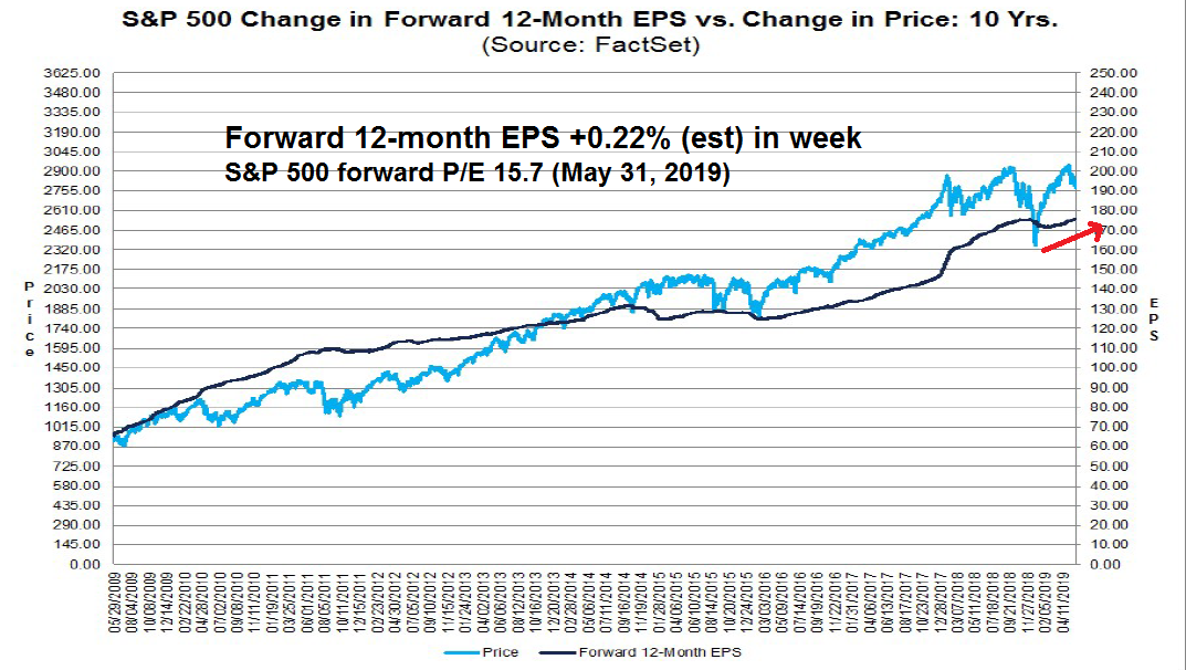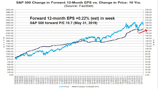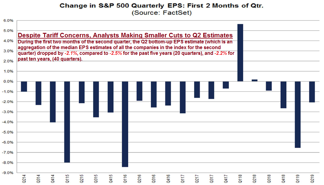 Despite the trade jitters, Q2 estimate revisions are slightly better than the historical averages. To be sure, the bears can validly argue that company analysts will not downgrade their forecasts until they can actually measure the effects of the trade war and quantify them. Strategists using top-down analysis have reduced S&P 500 earnings by about 5% should the next round of 25% tariffs on the remaining $300 billion of Chinese imports.