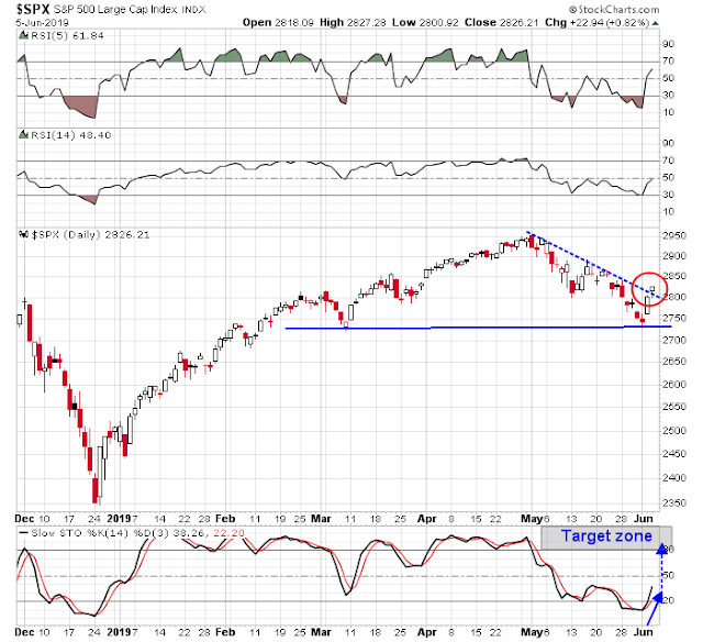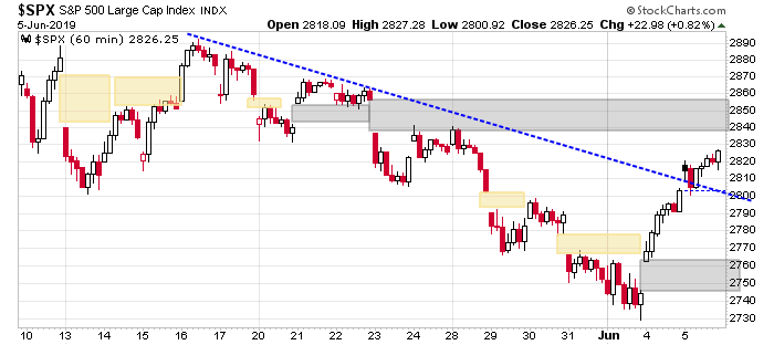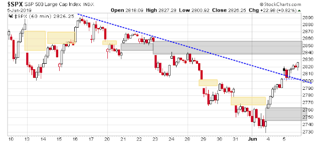 Mid-week market update: I had been making the point for the past week that this market is oversold and ripe for a relief rally, and the rally finally occurred. From a technical perspective, the market rallied through a downtrend line, which is a sign that the bulls have seized control of the tape. However, the bulls shouldn’t overstay their welcome. Until the trade tension overhang is lifted, this market is likely to remain volatile and range-bound. One characteristic of this uncertainty are the numerous gaps that can be found on the hourly chart.
