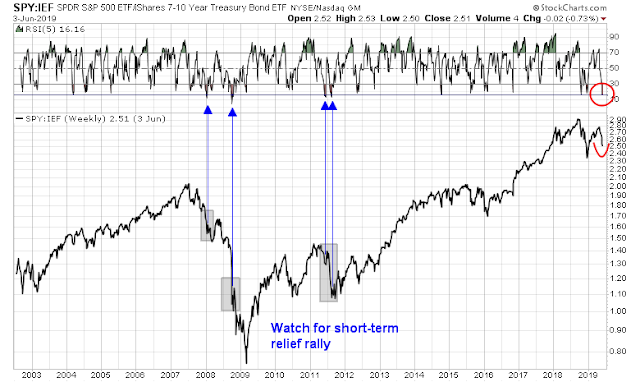 Another way of estimating the duration and size of the relief rally is to observe how the market behaved during oversold extremes. Here is one indication of how oversold the market became on Monday, which represented the near-term nadir of the pullback. Based on the 5-week RSI, the weekly chart of SPY to IEF (7-10 year Treasury ETF) has only been this oversold four other times in the last 14 years, indicating a stampede out of stocks and into the safety of Treasury paper.