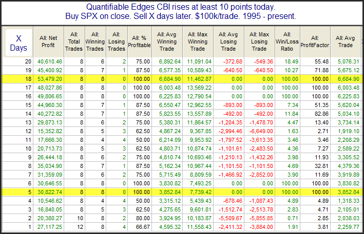 I highlighted analysis from Rob Hanna at Quantifiable Edges on Monday (see Panic is in the air) that his CBI indicator had spiked 10 points on Friday, which is almost unheard of because a reading of 10 is considered to be a buy signal. Hanna found that subsequent returns were strongly positive, though the market did not always rally right away.