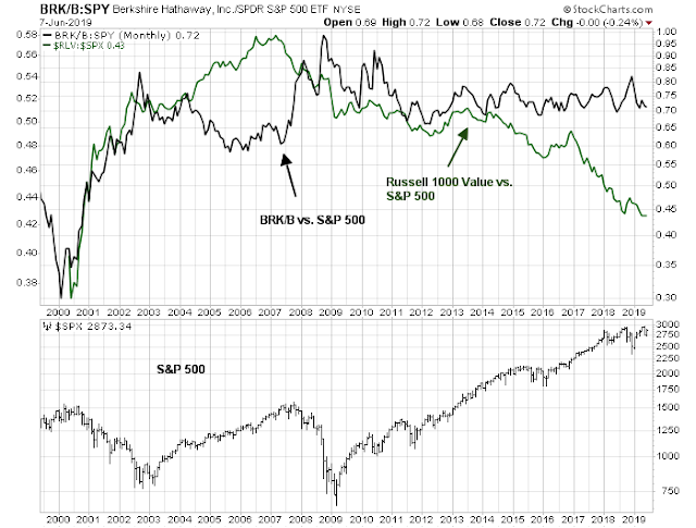 One way is to just give your money to Warren Buffett. While Buffett’s investing style is not value investing in the classic sense, the shares of Berkshire Hathaway has performed roughly in line with the market over the last 10 years. That’s quite an accomplishment in light of how the Russell 1000 Value Index lagged the market (green line). Moreover, Berkshire shares held up relatively well in the last two bear markets, and if history is any guide, they should provide some downside protection in the next major bearish episode.