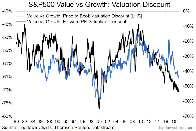 Value investing has taken it on the chin in the last decade, as the style has badly lagged the market. Callum Thomas documented how value discount has grown over the last decade. The discount has fallen to levels last seen at the height of the NASDAQ Bubble, when internet related stocks came crashing to earth, and value stocks outperformed.