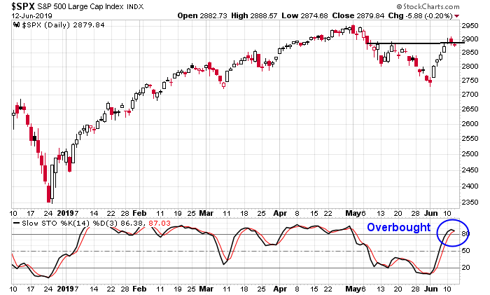 I also said that I am watching the daily stochastic to watch for an overbought signal for the signs of a possible stall. The stochastic rose into overbought territory yesterday. Another telltale sign of impending weakness appeared on Monday when the index formed a graveyard doji, which can indicate a bearish reversal.