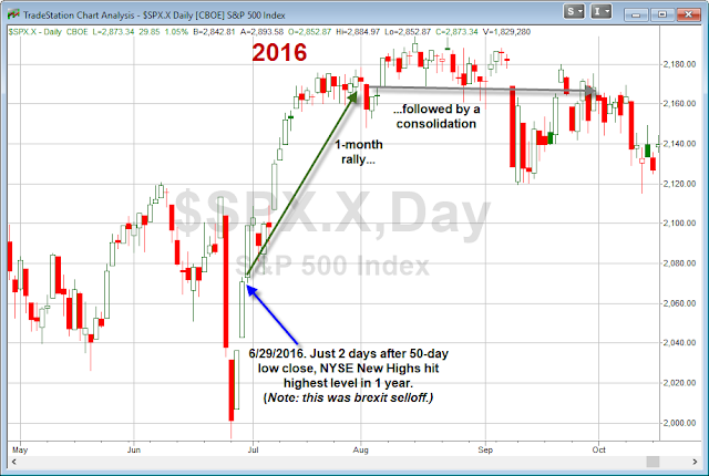Rob Hanna at Quantifiable Edges went back in time and studied new 52-week high surges from a market low. He found that these are rare events (N=3).