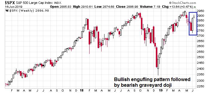 The weekly chart is equally puzzling and presents a case of fun with technical analysis. If the engulfing reversal the previous week was bullish, why was it followed by a bearish graveyard doji the next week?