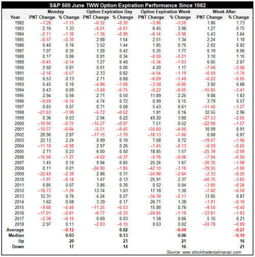 A more detailed historical analysis of June OpEx from Jeff Hirsch at Almanac Trader does inspires neither bullish nor bearish confidence.