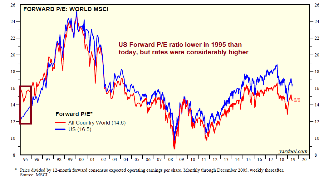 The subsequent rise in equity prices was not surprising, but it cannot be said that the rally was purely valuation driven. Data from Yardeni Research Inc. shows that US forward P/E ratios were lower than they are today, but both short and long rates were considerably higher in 1995 than they are today. By contrast, global forward P/E ratios are roughly the same level they were in 1995.