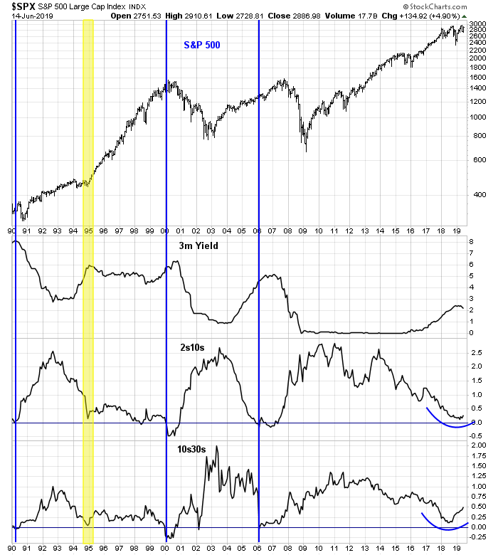As a reminder, here is how interest rates, stock prices, and the yield curves behaved since 1990. The yield curve, as measured by the 2s10s and 10s30s, were on the verge of inverting when the Fed stepped in and began to ease policy. Stock prices consequently took off, and the run did not end until the NASDAQ Bubble burst in 2000. By contrast, the vertical lines depict the instances when the 2s10s and 10s30s both inverted, and the stock prices topped out soon afterwards. The key difference today is while the 3-month yield is above the 10-year, the 2s10s and 10s30s are nowhere near inversion.