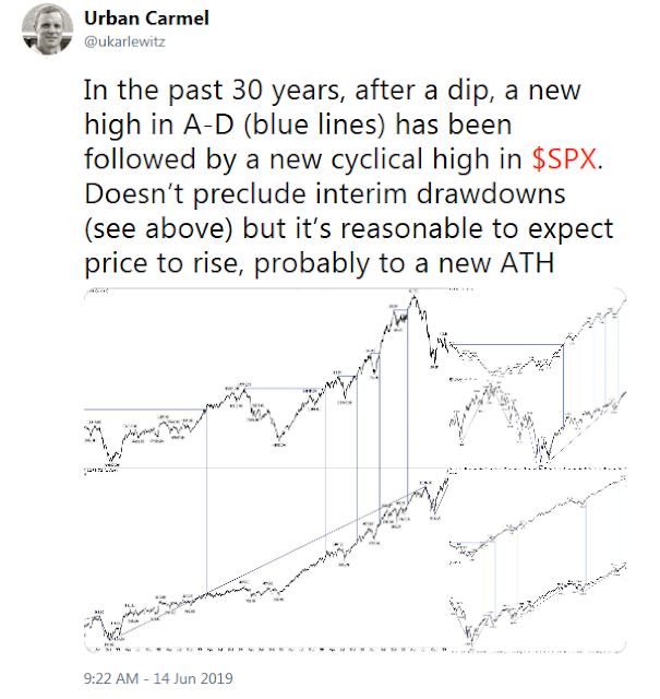I conclude that while the Fed could decide to cut rates at its July FOMC meeting, the future path of interest rates and stock prices depends on the reasoning behind the rate cut. If the cut is in response to the eruption of a full-blown trade and economic cold war with China, then it is likely to be the start of a protracted rate cut cycle, with bearish implications for equity prices. On the other hand, if the rate cut is an “insurance” cut designed to head off further economic weakness in the face of a stalemated trade dispute, I expect the cut to be reversed relatively quickly because the global growth backdrop remains constructive. Equity prices would rise under such a scenario as the bullish implications of higher growth would overwhelm the bearish implications of higher interest rates.