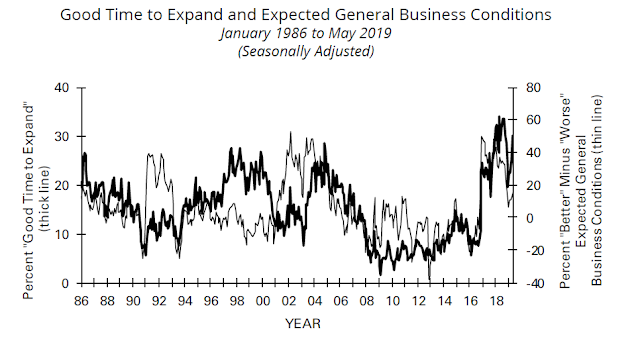 Another set of indicators that I like to monitor come from the NFIB monthly survey, which is useful because small businesses have minimal bargaining power and they are therefore sensitive barometers of the economy. The latest May 2019 NFIB survey shows small business confidence to be on fire. Confidence rose to 105.0 after a late 2018 decline “thanks to strong hiring, investment, and sales,” Unlike the Beige Book or other surveys, there are zero mentions of tariffs.