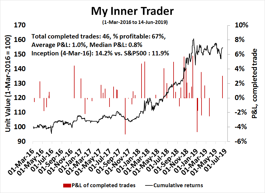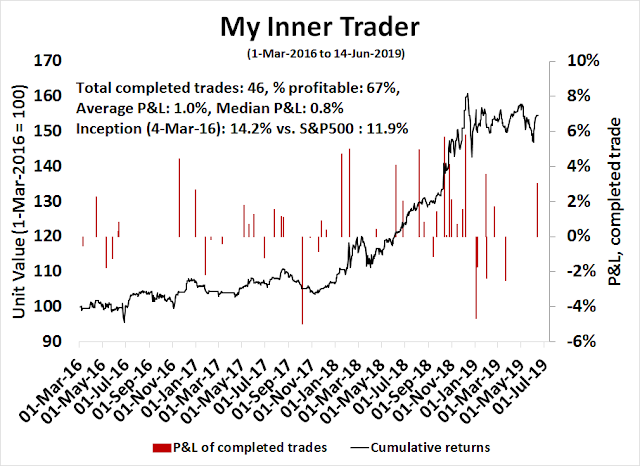 My inner trader uses a trading model, which is a blend of price momentum (is the Trend Model becoming more bullish, or bearish?) and overbought/oversold extremes (don’t buy if the trend is overbought, and vice versa). Subscribers receive real-time alerts of model changes, and a hypothetical trading record of the those email alerts are updated weekly here. The hypothetical trading record of the trading model of the real-time alerts that began in March 2016 is shown below.