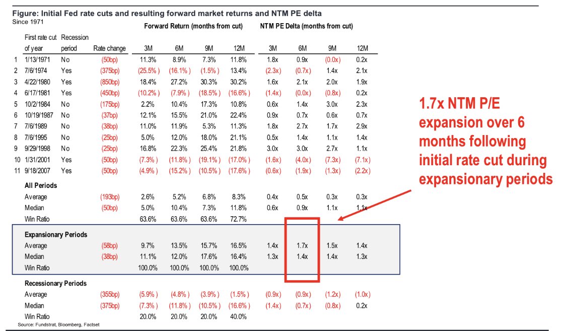 Strategist Tom Lee pointed out that the equity markets perform well in the wake of a first rate cut, as long as the economy is not in recession. Since 1970, stocks rise an average of 16% nine months after the first rate cut, and P/E ratio expands by 1.7.