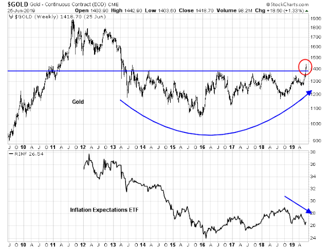 Gold bugs have pointed to gold as an inflation hedge, but this chart showing gold prices and inflationary expectations disprove that theory. Even as gold prices rose, inflationary expectations have been falling.