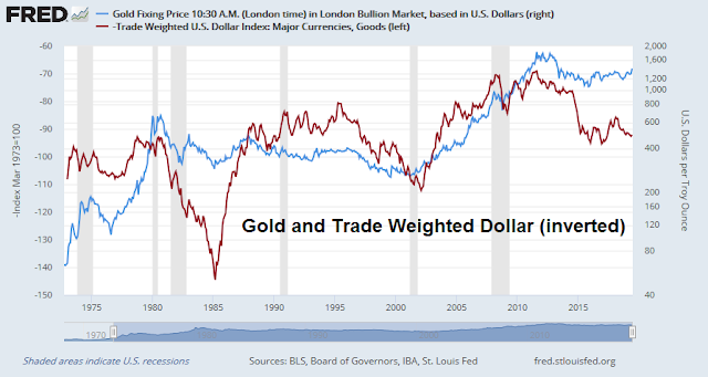One of the drivers of strong gold prices is a weak US Dollar. Historically, gold has seen a rough inverse correlation with the trade weighted dollar (inverted on chart).