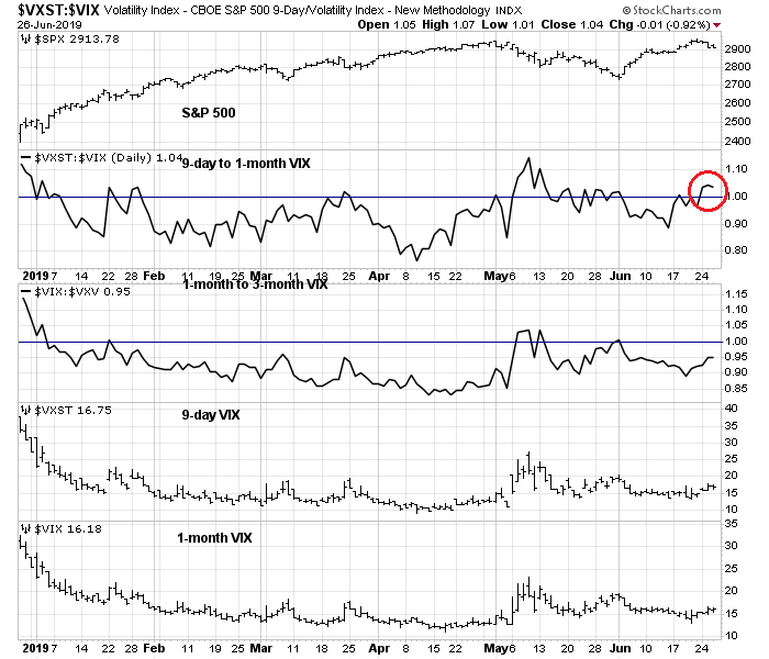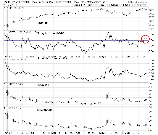 Short-term option sentiment is exhibiting minor levels of anxiety. 9-day VIX (VXST) has spiked above 1-month VIX. Since the G-20 meeting is within the VXST window, this development is entirely to be expected, though I would have thought that the degree of term structure inversion would have been more pronounced.