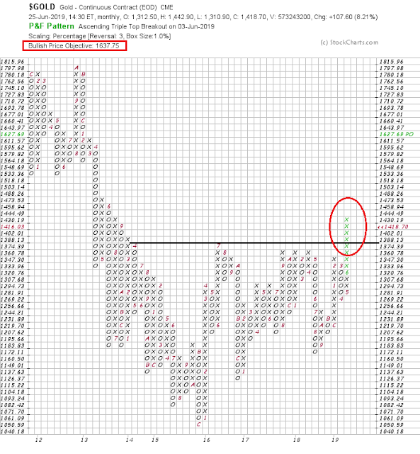 Mid-week market update: Gold staged an upside breakout from a multi-year base, which got a lot of technicians excited. The point and figure chart upside targets range from about 1630 to the mid-1700s, depending on how the parameters are set.