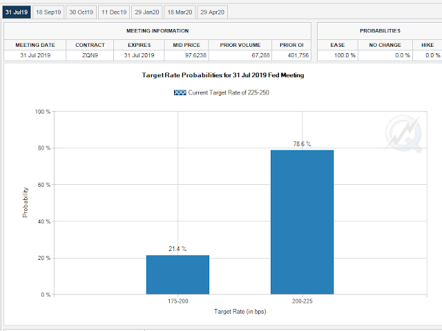 Now that we have achieved a detente of sorts, the CME’s Fedwatch Tool shows the market is still discounting a 100% likelihood of a quarter-point rate cut at the July FOMC meeting, and a 21.4% chance of a half-point cut.