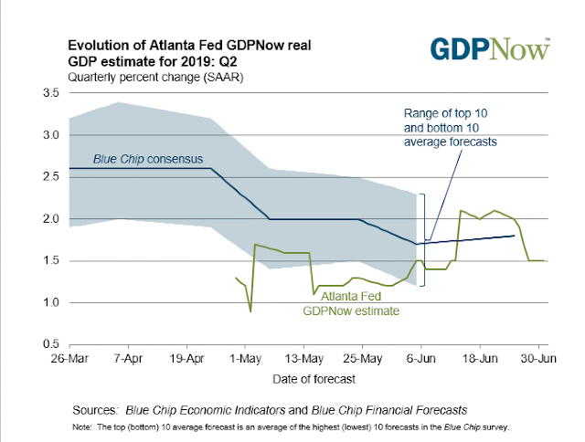 Economic growth is slowing. The Atlanta Fed’s Q2 GDPNow is tracking at 1.5%, while the New York Fed’s nowcast is at 1.3%. That’s quite a slowdown compared to the red hot 3.2% growth rate in Q1.