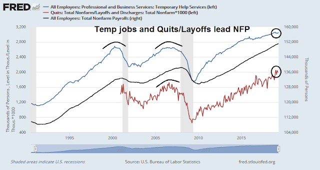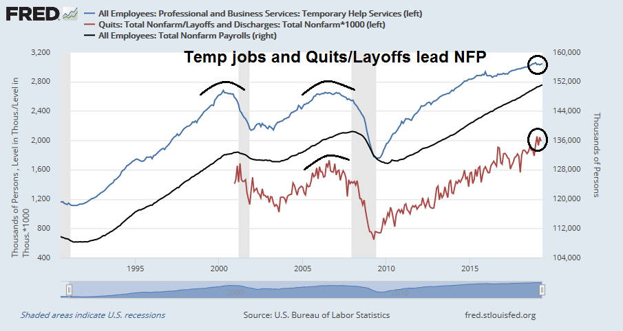 I will also be watching the evolution of temp jobs, which has historically led NFP. The quits to layoffs rate, which is reported in the JOLTS and not the NFP report, has also shown a similar leading relationship. There are some early signs of softness in both temp jobs and quits to layoffs. If the economic soft patch continues, I would expect the weakness in these two indicators to become even more evident.