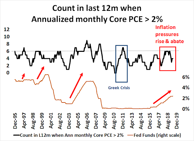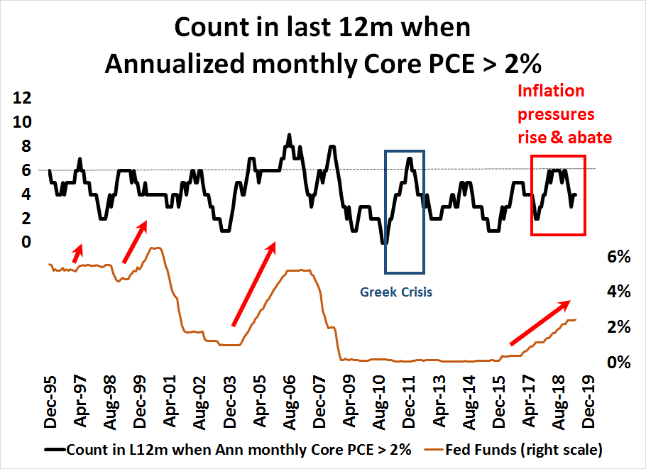 However, I would argue that it is the uptick in inflation that is transitory. Historically, the Fed has faced pressure to raise rates whenever the % of times in the last 12 months that the annualized core PCE has exceed 2% is greater than 50%. As the chart below shows, inflationary pressures have been easing. While they have edged up a little, current conditions can hardly be described as uncontrolled runaway inflation. At a minimum, the Fed should be on pause, and a slight easing bias would not be unusual under the circumstances.