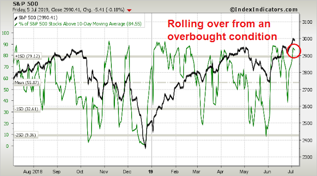 The market is overbought on both a short-term and long-term basis. Short-term breadth reached an overbought condition and it is now beginning to roll over, which is interpreted by traders as a tactical sell signal.