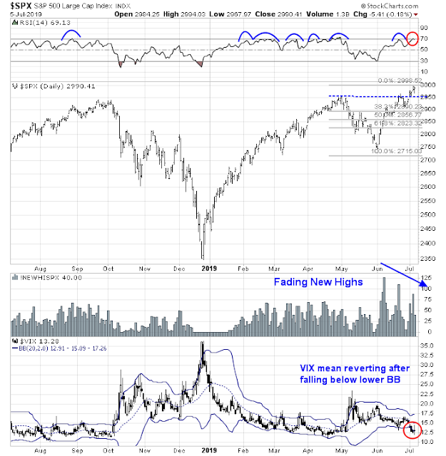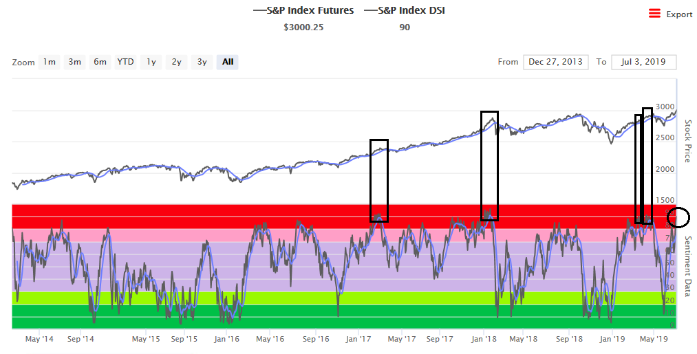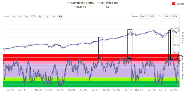 From a longer term perspective, the Daily Sentiment Index (DSI) reached 90 last week. While DSI is not a precise trading indicator, past readings at similar levels has seen the market advance either stall out, or form a blow-off top (January 2018).