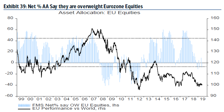 The first prerequisite of any ugly duckling candidate is its unloved nature. As the latest BAML Global Fund Manager Survey shows, managers have replaced what was once enthusiasm with indifference. BAML reported that short eurozone equities is the fourth most crowded trade, and current positioning is 0.9 standard deviations below its long-term average.