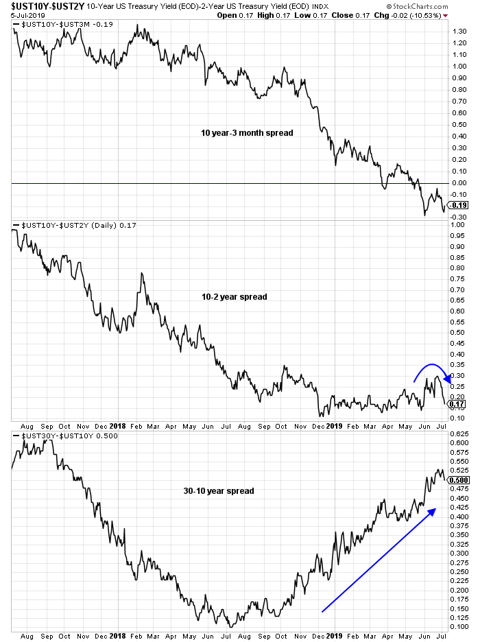 If neither Technology (NASDAQ) nor cyclical growth are the underlying drivers of higher stock prices, what about interest rates? The much stronger than expected June Jobs Report on Friday cast doubt to the thesis that the Fed would be starting a rate cut cycle. Even before the blow-out Jobs Report, the 2s10s yield curve had been flattening, indicating the bond market expected slower growth. That said, the 10s30s remain steep at a spread of 0.50%.