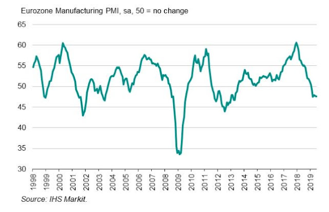 It was therefore no surprise that periodic financial crises erupted, such as Greece. Other peripheral countries have also teetered, and the latest is Italy, which is too big to save and the source of much angst among investors. Today, eurozone manufacturing PMI is signaling a slowdown.