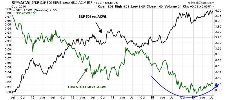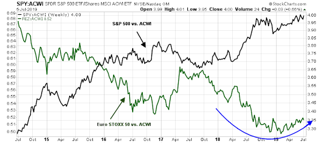 I have identified such a candidate. The chart below shows the relative performance of US stocks against the MSCI All-Country World Index (ACWI) in black, and the Euro STOXX 50 against ACWI in green. While there is no question that US stocks have been the winners, eurozone equities are in the process of making a broad saucer based relative bottom, and may be poised for a period of outperformance. The relative bottoming process is especially remarkable in light of the current environment of global trade uncertainty, which may be a signal of investor capitulation and the inability to respond to bad news.