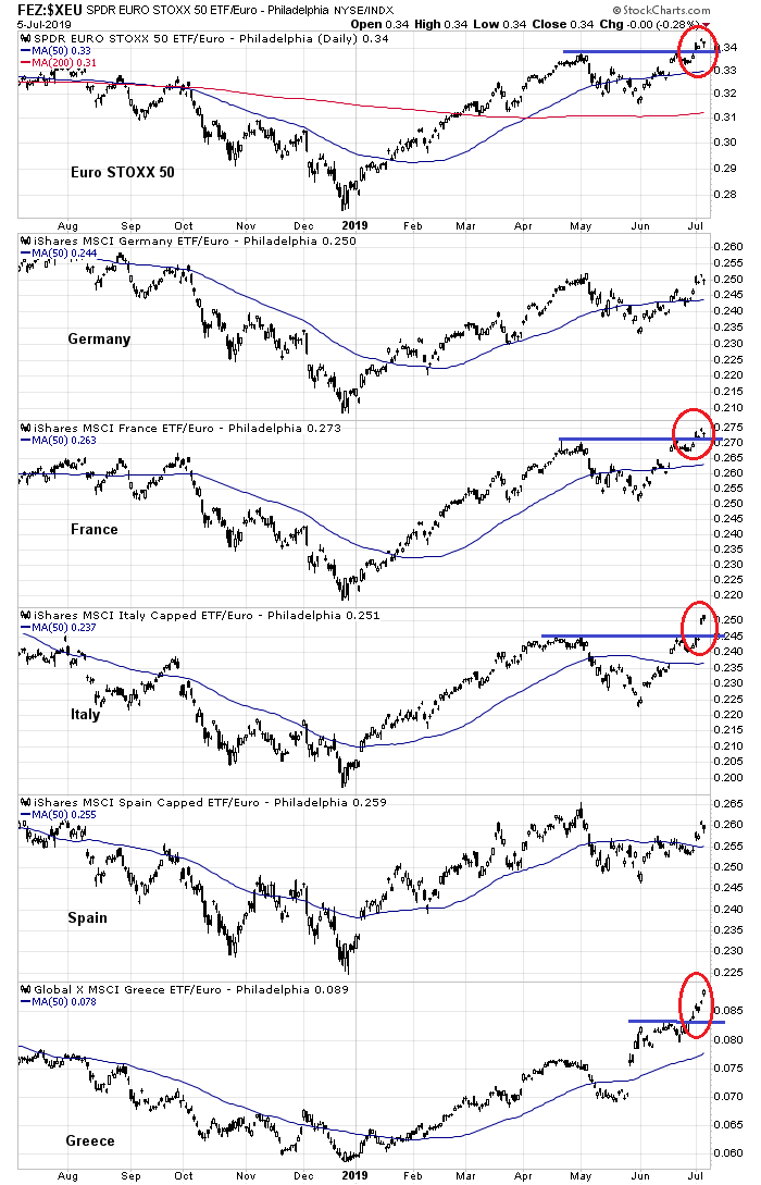 From a technical perspective, the Euro STOXX 50 has staged an upside breakout to fresh highs, and a number of other countries are also undergoing upside breakouts. Most notably, troubled peripheral country indices such as Italy and Greece (yes, that Greece) are leading the way upwards.