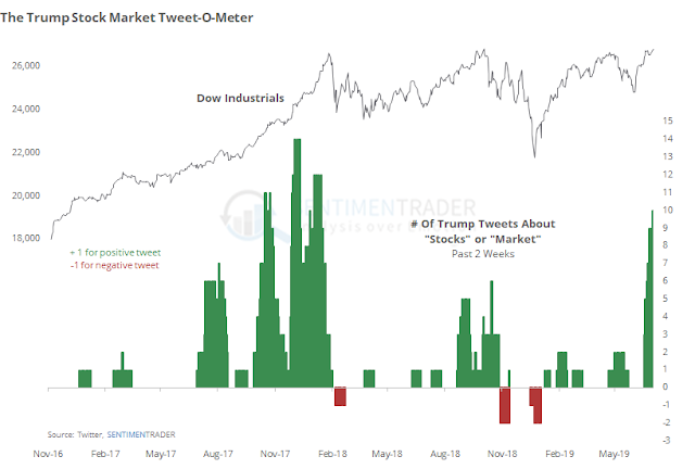 Similarly, SentimenTrader constructed a Trump Tweet-o-Meter of his stock market tweets. While the Tweet-o-Meter is also not a precise timing indicator, it does have a contrarian element when readings are high.