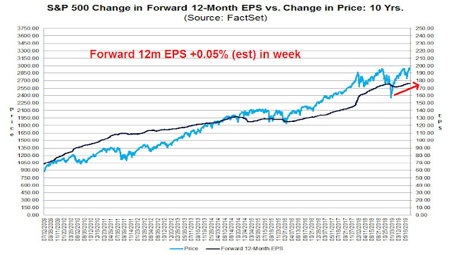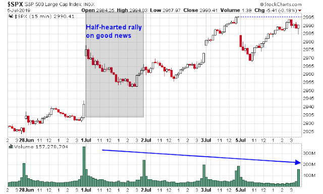 Looking to the week ahead, there are numerous signs that the bulls are in trouble. The first hint came last Monday, when the market staged a half-hearted attempt at a rally after the good news of a Sino-American trade truce. The market gapped up, and then spent most of the session losing ground, until a rally in the last hour recovered some ground. To be sure, prices did rise to new all-time highs later in the week, but the advance was characterized by declining volume.