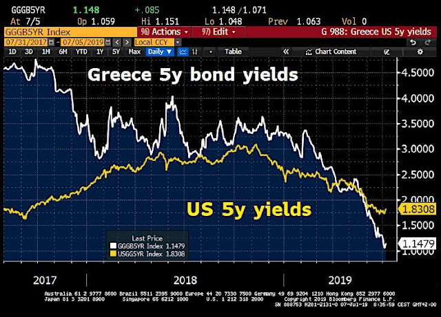 Mario Draghi once said that the ECB would do “whatever it takes” to save the euro. It has largely been successful. The ECB unveiled an alphabet soup of programs to buy member states time to enact structural reforms. While the reform efforts have been mixed, risk premiums have shrunk dramatically. To illustrate the success of the “whatever it takes” commitment, Greek 5-year debt is roughly 0.7% below equivalent USTs.