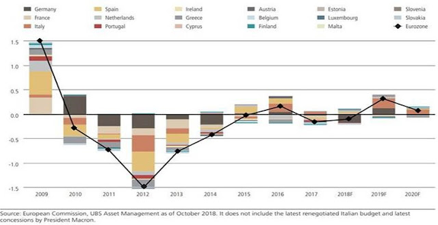 While Draghi’s “whatever it takes” commitment was an effective backstop to past problems in the eurozone, the ECB’s programs represent only a band-aid solution, and it illustrates the limits of the powers of central banking. In order to revive growth, Draghi has pleaded with member states with the fiscal room (read: Germany) to embark on fiscal stimulus. Right now, the region’s fiscal thrust is being led by Italy, which is one of the weakest economies.