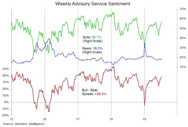 Other measures of sentiment show a wide range of disagreement. On one hand, the latest Investors Intelligence sentiment shows that optimism is building. Bullishness as risen past past the 2019 peak, and readings are similar to levels last seen in October 2019.