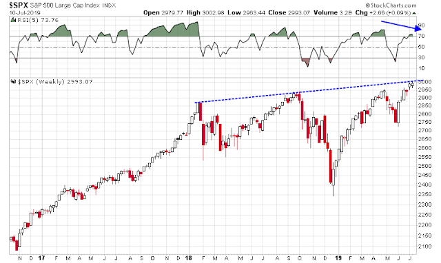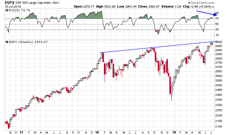 As well, the weekly chart shows the market approaching a key overhead resistance level while flashing a negative divergence on the 5-week RSI – which is another warning sign.