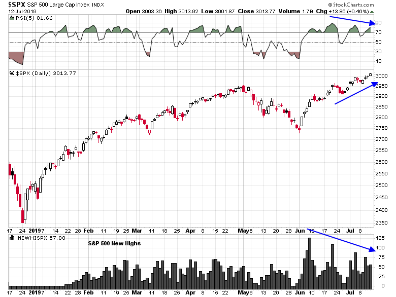 A negative 5-day RSI divergence can be seen in the daily price chart, along with fewer and few new highs even as the index rises.