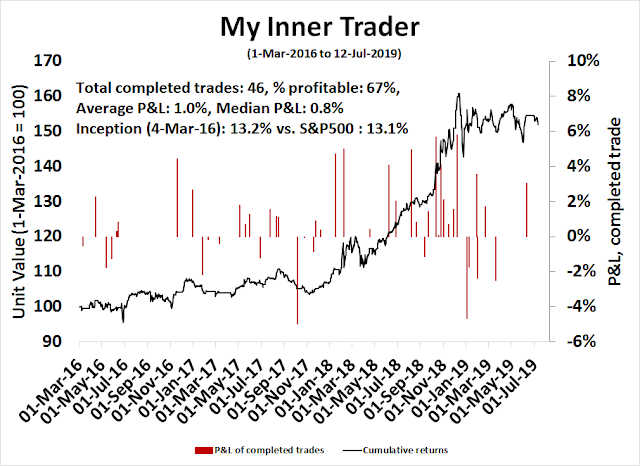 My inner trader uses a trading model, which is a blend of price momentum (is the Trend Model becoming more bullish, or bearish?) and overbought/oversold extremes (don’t buy if the trend is overbought, and vice versa). Subscribers receive real-time alerts of model changes, and a hypothetical trading record of the those email alerts are updated weekly here. The hypothetical trading record of the trading model of the real-time alerts that began in March 2016 is shown below.