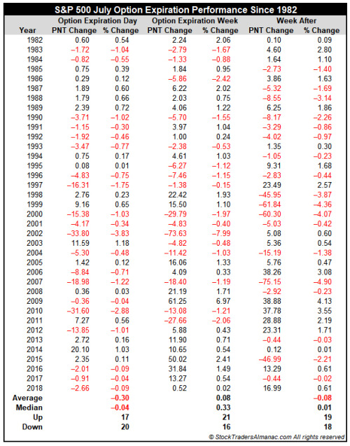 Next week is option expiry (OpEx) week. Even though OpEx week has been historically bullish, Jeff Hirsch at Almanac Trader found that both July OpEx week, and the week after OpEx has seen subpar returns.