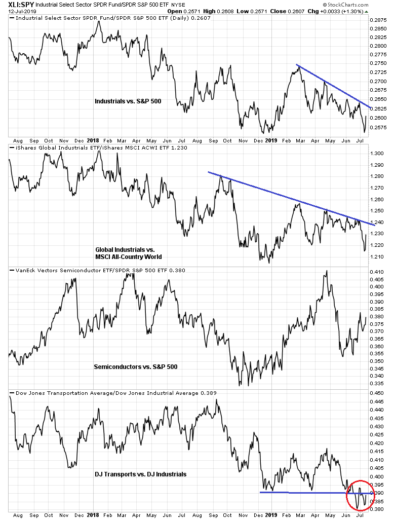From a technical perspective, the relative performance of cyclical stocks confirms the fundamental analysis of economic weakness. In particular, the poor relative strength exhibited by the Dow Jones Transports is a concern.
