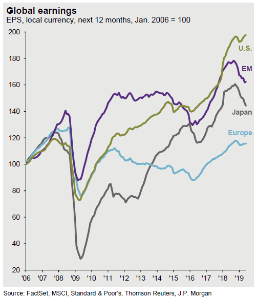 There are a number of criticisms of comparing P/E ratios across borders. Notwithstanding differences in accounting standards, index composition is very different in the US compared to Europe. Moreover, forward earnings grew much faster in America than in the Old World, therefore the US market deserves a premium multiple.