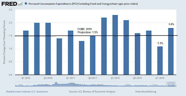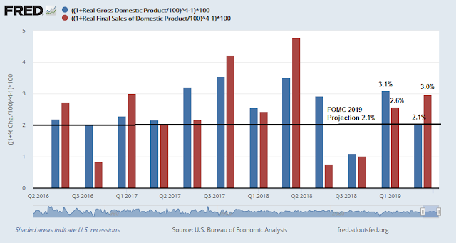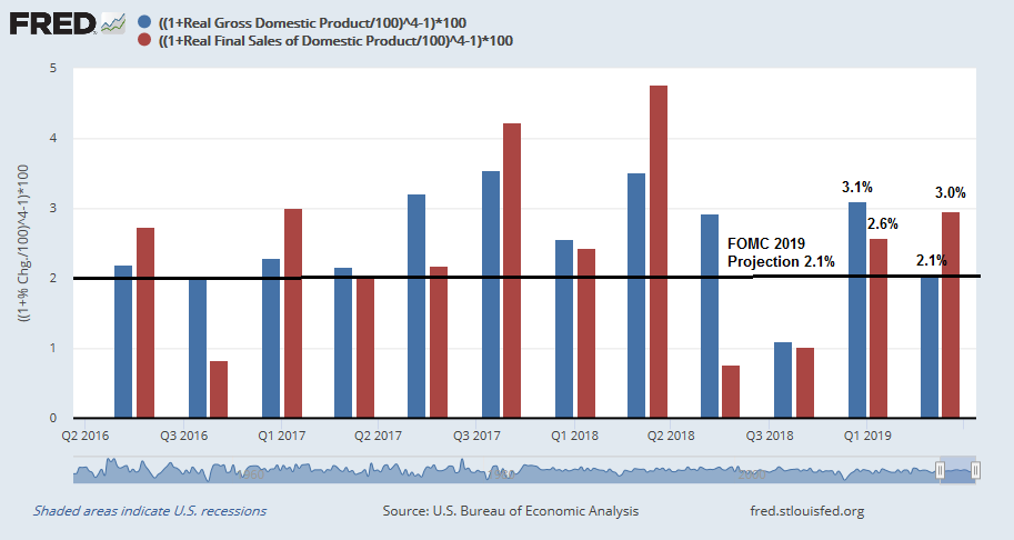 Q2 GDP came in above expectations at 2.1%. What`s more, real final sales to private domestic purchasers, which is a more stable measure of GDP growth, rose 3.2%. The latest FOMC median projections of 2019 GDP growth is 2.1%. GDP growth would have to slow to 1.4% to 1.6% for the remainder of 2019 to reach 2.1%. Watch if the Fed revises 2019 growth upwards. If the economy is that strong, why does it need to continue cutting rates?