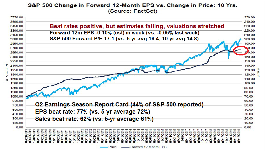 FactSet reported that the beat rates from Q2 earnings season are above average, but the forecast E is falling. Since forward earnings move roughly in lockstep with stock prices, flat to falling EPS estimates opens up downside risk for equities.