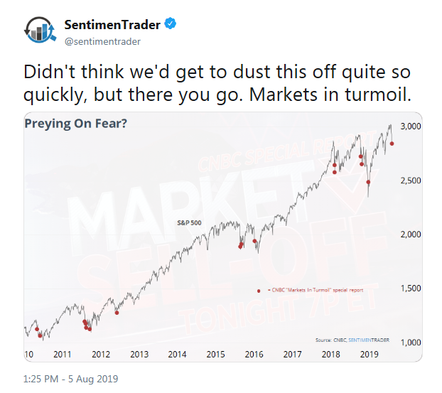 Mid-week market update: My trading model has turned bullish, and there are plenty of signs that the market is ripe for a relief rally. There was the CNBC Markets in Turmoil program Monday, which as SentimenTrader pointed out, tends to mark short-term bottoms.