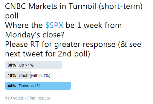After Monday’s close, I conducted an (unscientific) Twitter poll of short and longer term sentiment. The one-week outlook was tilted slightly bearish.