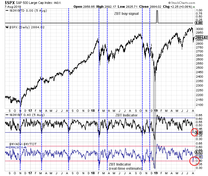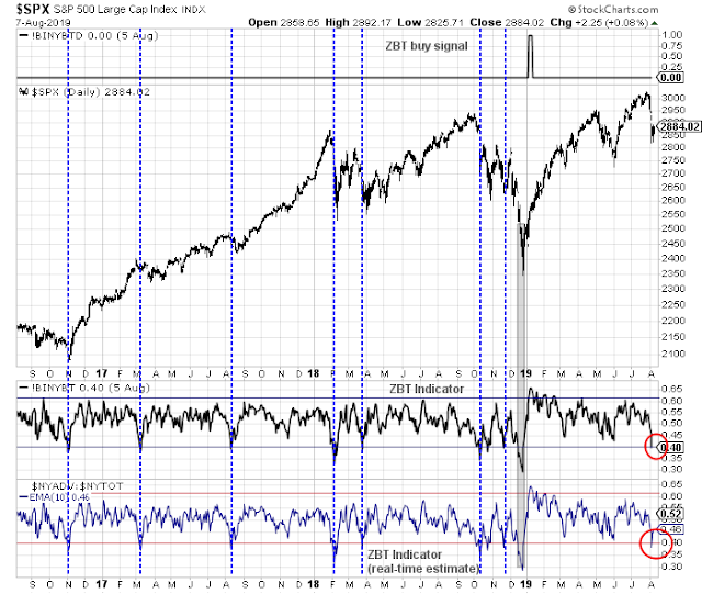 A study of recent ZBT oversold signals shows that the length of the subsequent rallies have lasted between one day to two weeks, with one week being the best estimate. Subscribers received an alert today indicating that my trading account had bought the market. I expect this rally to last about a week, and I will exit the long position early next week.