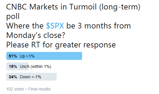 The longer term three-month outlook is far too sanguine. While I recognize the limitations of Twitter polls, these results, combined with the II sentiment survey, leads me to believe that the market is in need of a further decline before sentiment can properly reset.